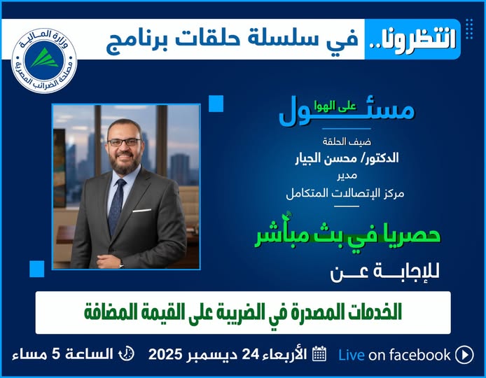 حلقة يوم الأربعاء الموافق 24 ديسمبر 2025 في تمام الساعة الخامسة مساء في حلقة جديدة من #برنامج_مسئول_على_الهواحصريا في بث مباشر علي الصفحة الرسمية لمصلحة الضرائب المصرية على الفيسبوك للإجابة علي جميع تساؤلاتكم حول" الخدمات المصدرة في الضريبة على القيمة المضافه "مع ضيف الحلقةالدكتور/ محسن الجيار مدير مركز الاتصالات المتكامل |