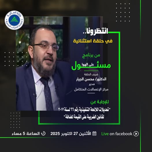 انتظرونا..يوم الأثنين الموافق 27 اكتوبر 2025 فى تمام الساعة الخامسة مساءفى حلقة جديدة من #برنامج_مسئول_على_الهواحصريا في بث مباشر علي الصفحة الرسمية لمصلحة الضرائب المصرية على الفيسبوك للإجابة علي جميع تساؤلاتكم حول" تعديلات اللائحة التنفيذية رقم ٦٦ لسنة ٢٠١٧ لقانون الضريبة على القيمة المضافة "مع ضيف الحلقةالدكتور/ محسن الجيار مدير عام مركز الاتصالات المتكامل. |