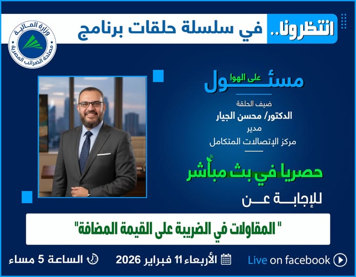 حلقة يوم الأربعاء الموافق 11 فبراير 2026 في تمام الساعة الخامسة مساء في حلقة جديدة من #برنامج_مسئول_على_الهواحصريا في بث مباشر علي الصفحة الرسمية لمصلحة الضرائب المصرية على الفيسبوك للإجابة علي جميع تساؤلاتكم حول" المقاولات في الضريبة على القيمة المضافة"مع ضيف الحلقةالدكتور/ محسن الجيار مدير مركز الاتصالات المتكامل. |