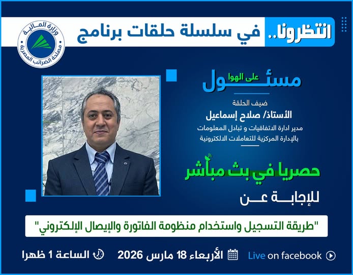 إنتظرونا..يوم الأربعاء الموافق 18 مارس 2026 فى تمام الساعة الواحدة ظهرافى حلقة جديدة من #برنامج_مسئول_على_الهواحصريا في بث مباشر علي الصفحة الرسمية لمصلحة الضرائب المصرية على الفيسبوك للإجابة علي جميع تساؤلاتكم حول" "طريقة التسجيل واستخدام منظومة الفاتورة والإيصال الإلكتروني "مع ضيف الحلقةالأستاذ/ صلاح إسماعيل مدير إدارة الإتفاقيات وتبادل المعلومات بالمركزية للتعاملات الإلكترونية . |