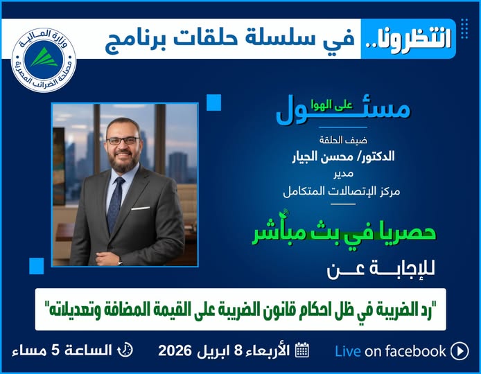 حصريا في بث مباشر علي الصفحة الرسمية لمصلحة الضرائب المصرية على الفيسبوك للإجابة علي جميع تساؤلاتكم حول