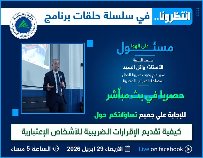 حلقة يوم الأربعاء الموافق 29 ابريل 2026 فى تمام الساعة الخامسة مساءفى حلقة جديدة من #برنامج_مسئول_على_الهواحصريا في بث مباشر علي الصفحة الرسمية لمصلحة الضرائب المصرية على الفيسبوك للإجابة علي جميع تساؤلاتكم حول" كيفية تقديم الإقرارات الضريبية للأشخاص الإعتبارية"مع ضيف الحلقةالأستاذ/ وائل السيد مدير عام ضريبة الدخل بقطاع البحوث الضريبية. |